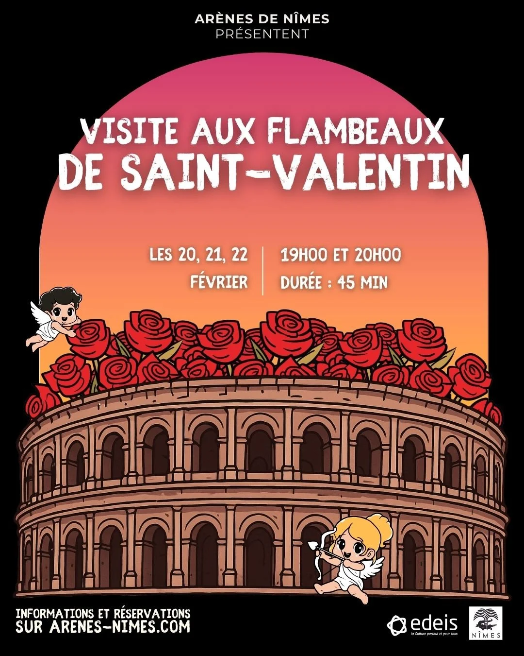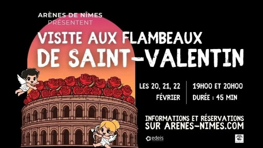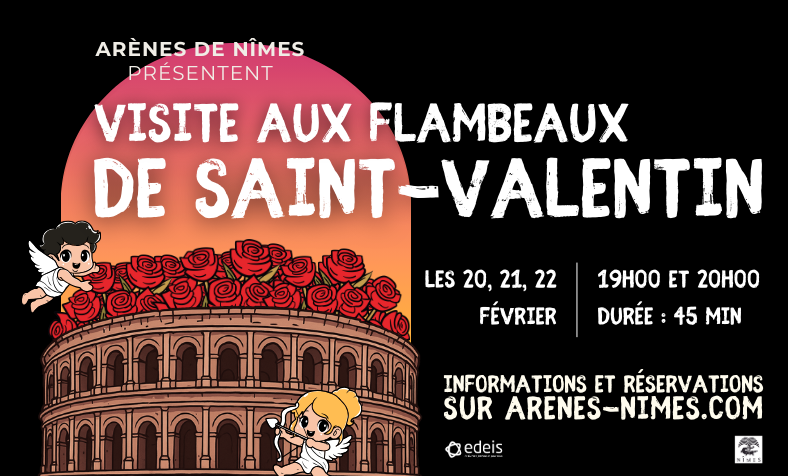 Sous la lueur des flambeaux, l’amphithéâtre s’embrase de récits de passion, de mythes divins et de coutumes anciennes. Entre ombres et lumières, laissez-vous porter par la magie d’une visite où le passé se mêle à l’esprit de l’amour, dans une atmosphère douce et mystérieuse.